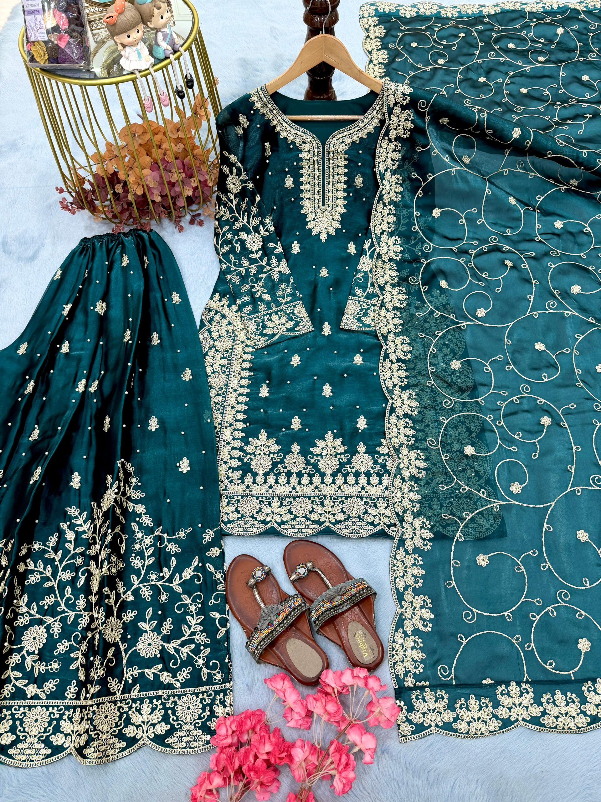 - *Plazzo Fabric*:Pur Gmy Silk With Heavy Embroidery 3 mm Sequence & Coding Dori Work With Rivet Moti Work