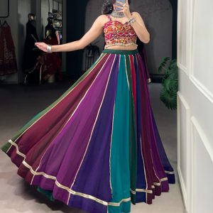 (Stitched) lehenga Choli features real mirror Gamthi work on the blouse paired with a multi-shaded flair skirt
